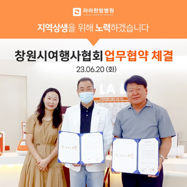 [MOU] 창원시여행사협회 업무 협약 목록 본문 라라한방병원과 창원시여행사협회가 6월 20일 (화) 오전 11시 라라한방병원에서 업무 협약을 체결했습니다. 이번 협약으로 라라한방병원은 창원시여행사협회의 협회원과 가족의 건강 증진을 위한 의료서비스를 제공합니다. 아울러 앞으로 유대관계를 강화하고 공동 발전을 위한 힘을 모으겠습니다. 감사합니다 목록으로 이전글라라한방병원 7월 진료 일정 안내 23.06.29 다음글[MOU] 삼성전자 업무협약 23.06.15