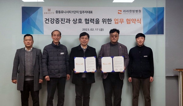라라한방병원과 중동유니시티 1단지 입주자대표회의가 지난 17일 업무 협약을 했다. 이번 협약으로 라라한방병원은 중동 유니시티 1단지 입주자 건강 증진을 위한 의료서비스를 제공한다. 아울러 두 기관은 유대관계를 강화하고 공동 발전을 위한 힘을 모으기로 했다.
