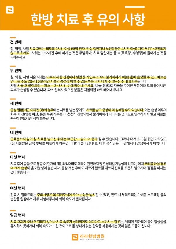한방치료 후 유의사항 목록 본문 라라한방병원 한방치료 후 유의 사항 안내드립니다. 꼼꼼하게 읽어 보신 후 문의 사항은 카카오톡 @라라한방병원 또는 전화 055-286-3377 로 연락부탁드립니다. 목록으로 이전글도수치료 후 유의사항 22.08.11