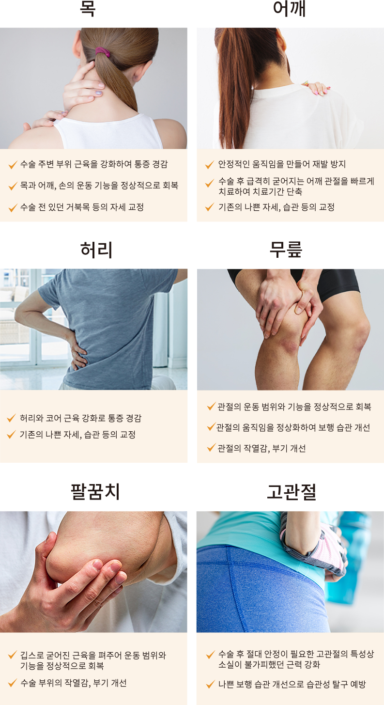 신체 본연의 기능을 강화 시켜 일상으로의 복귀를 한 층 앞당기는 역할을 합니다.