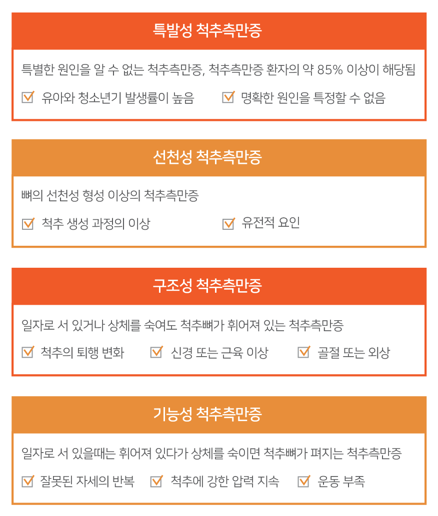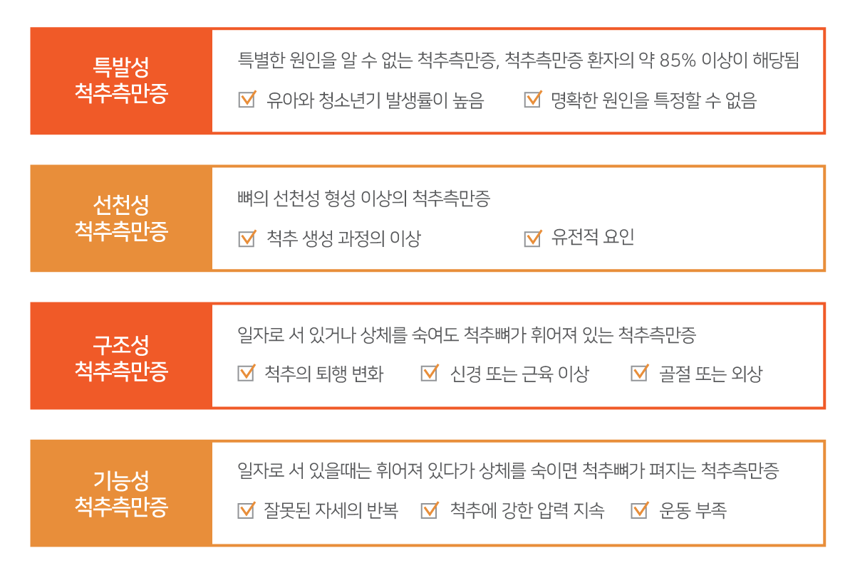 척추측만증은 발생 원인에 따라 특발성, 선천성, 구조성, 기능성 척추측만증으로 구분됩니다.