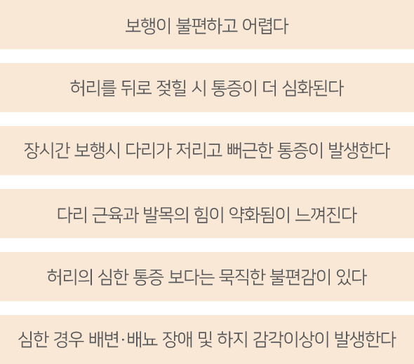 척추관이 좁아지면서 신경전도 및 혈액 순환을 저하시켜 발생합니다.
