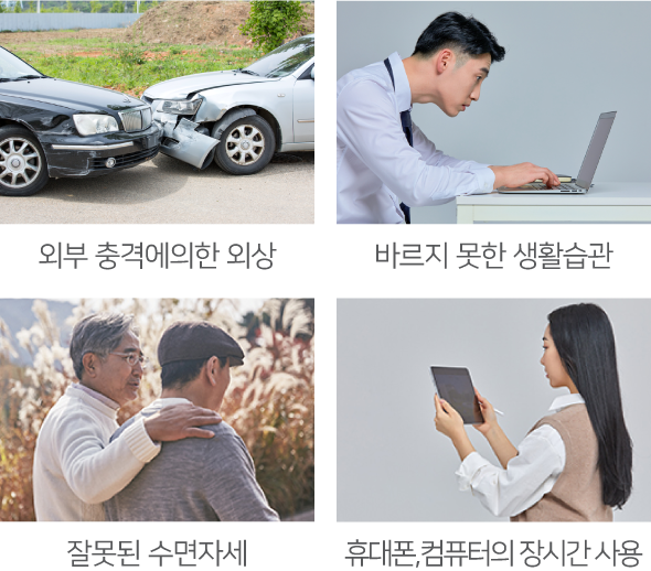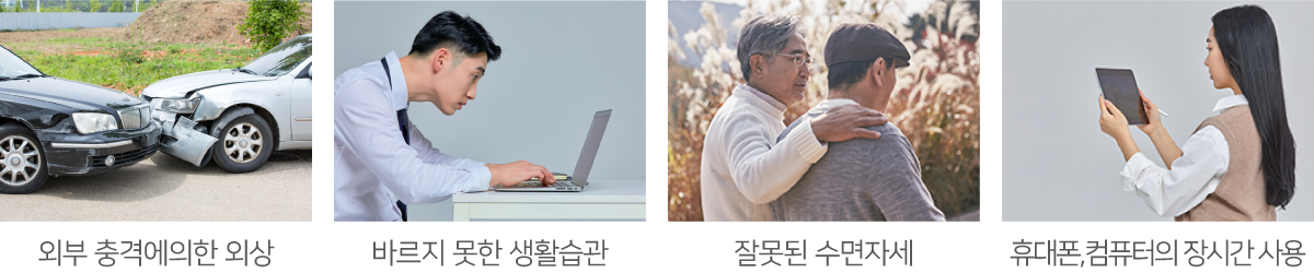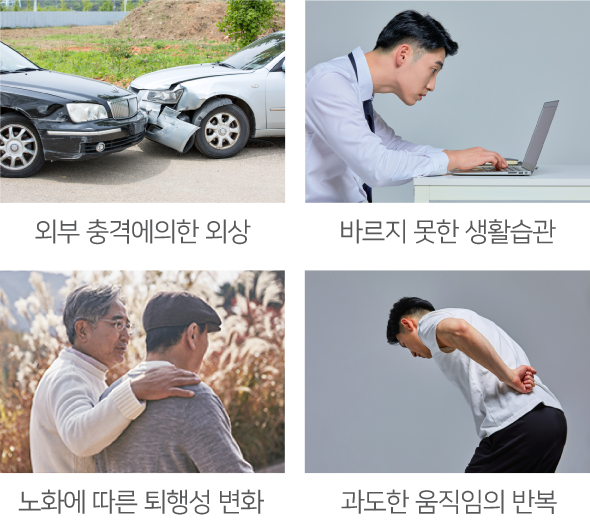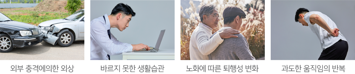 자연스러운 노화로 인한 관절과 디스크가 퇴행될 경우에 발생합니다.