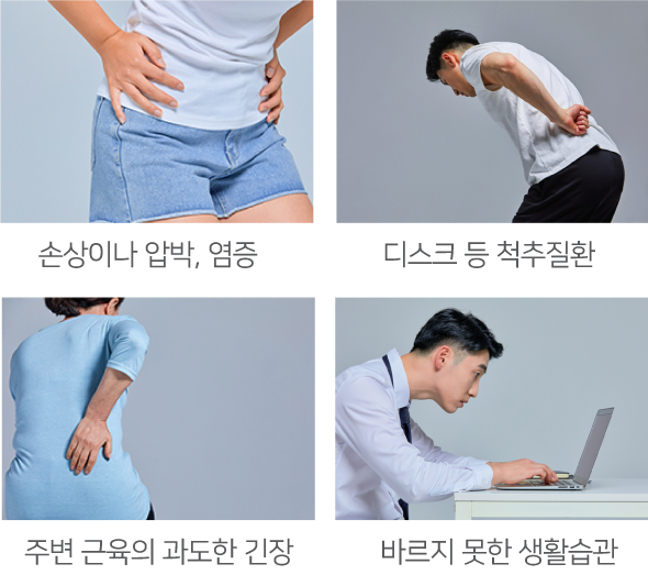 좌골신경이 눌리거나 좌골신경 자체 손상 또는 염증에 의해 발생하기도 하며,